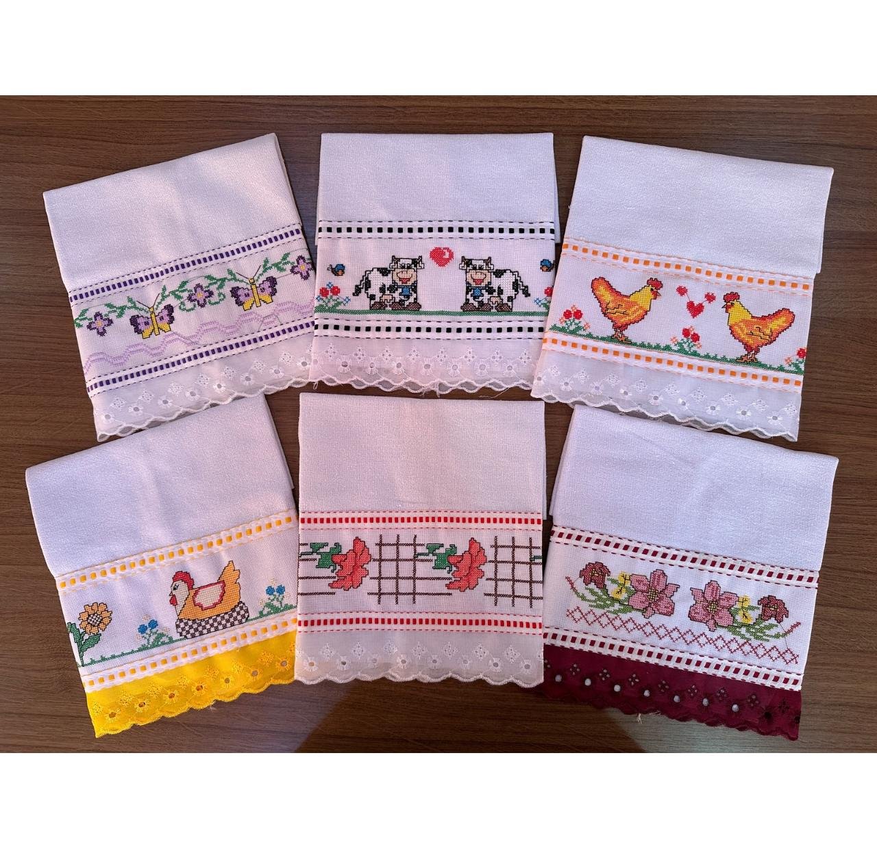 Contém: 10 unidades de Pano de Copa Ponto Cruz Bordado Inglês variados